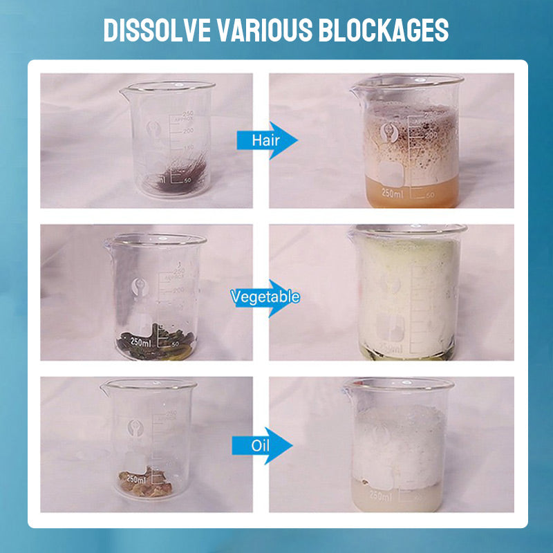 * Kraftfull funktion: Den kan snabbt lösa upp stopp i rör som hår, papper, tvålrester, grönsaker, frukt, matrester, fett och organiskt material.