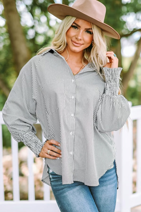 Pojkvänsskjorta med smockade manschetter: Randiga skjortor för kvinnor med fickor, snygg V-ringning, randigt mönster, smockad långärmad skjorta med rynkor, sommartunika för kvinnor. Avslappnad och kreativ design gör att du ser snygg och charmig ut.