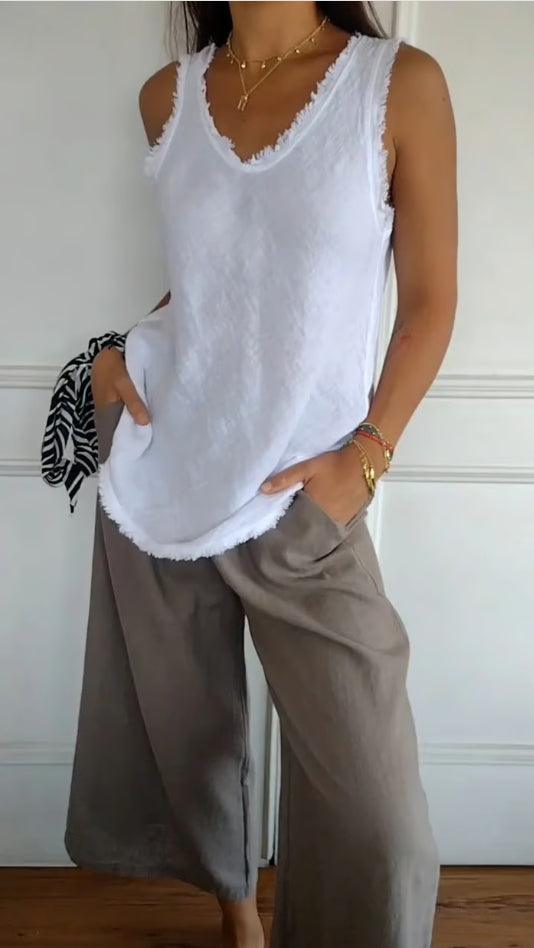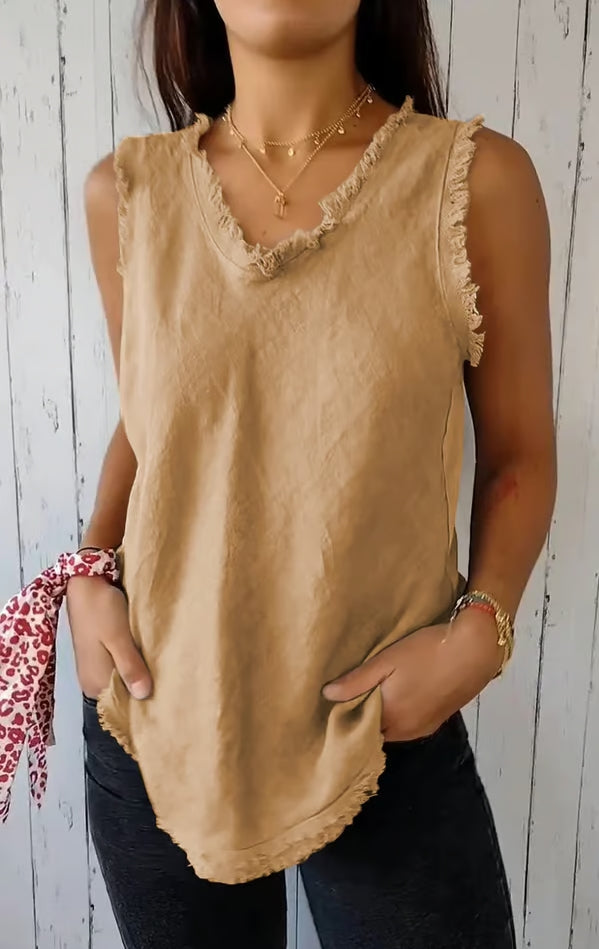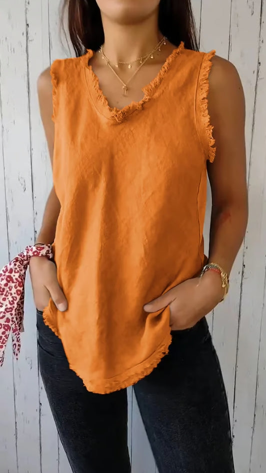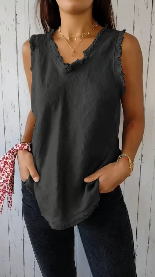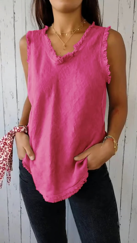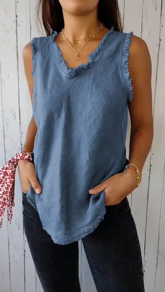 😍👕Denna väst har en unik design med råa kanter och en smickrande V-ringning för en elegant och modern look.