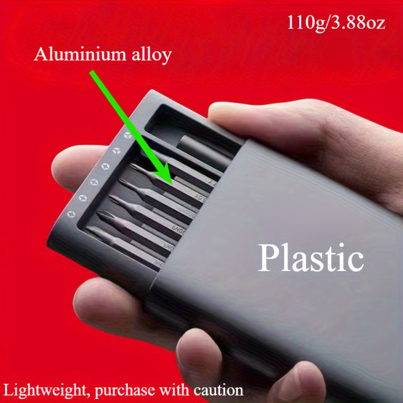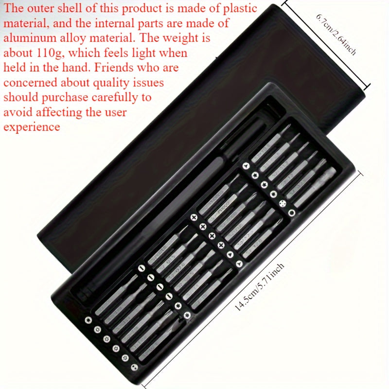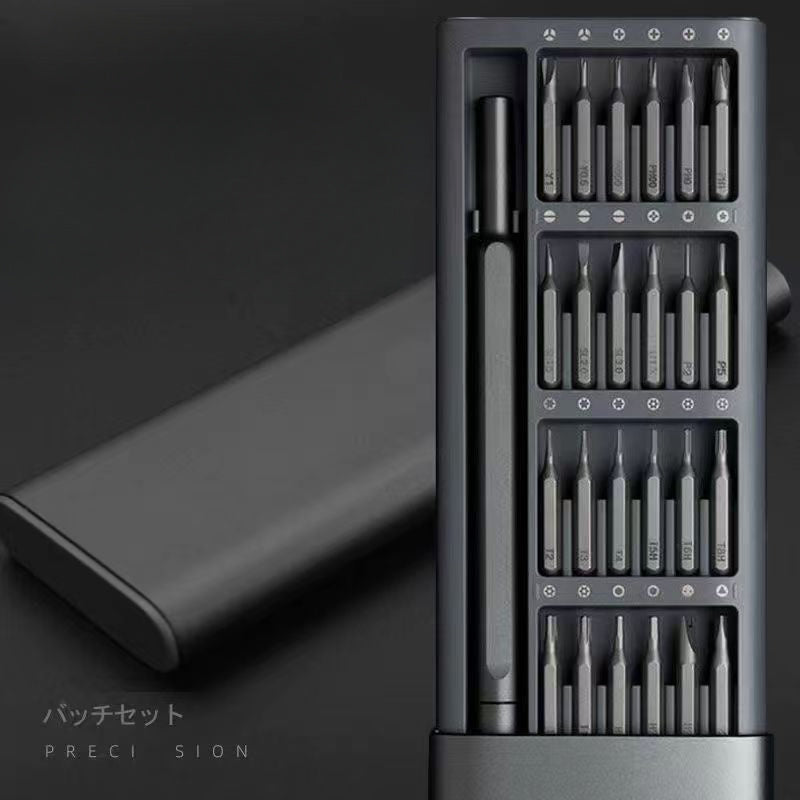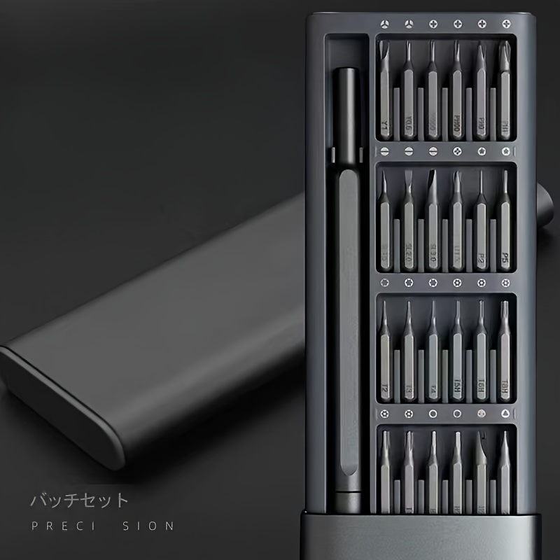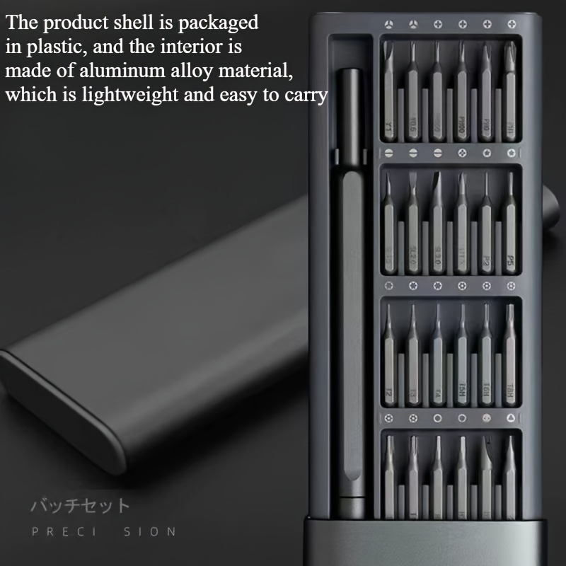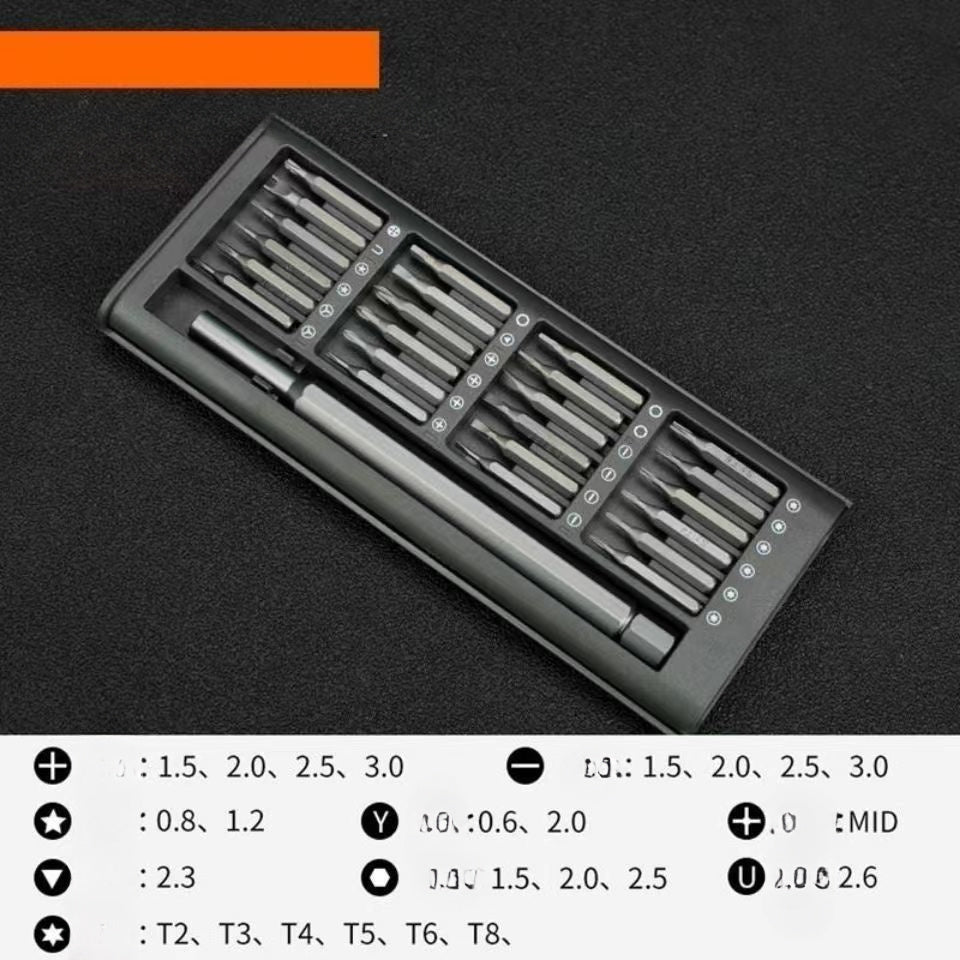 • 24 precisionsskruvmejselbits: Satsen innehĂ„ller 24 precisionsskruvmejselbits som noggrant har valts ut för att passa en mĂ€ngd olika skruvar till elektroniska enheter som finns pĂ„ marknaden.