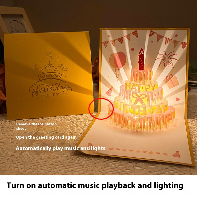 Detta är inget vanligt födelsedagskort. När det öppnas spelas en vacker melodi automatiskt, och en tredimensionell födelsedagstårta lyser under färgglada ljus. 🎂💡