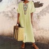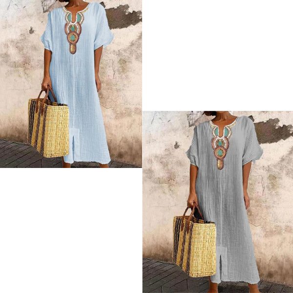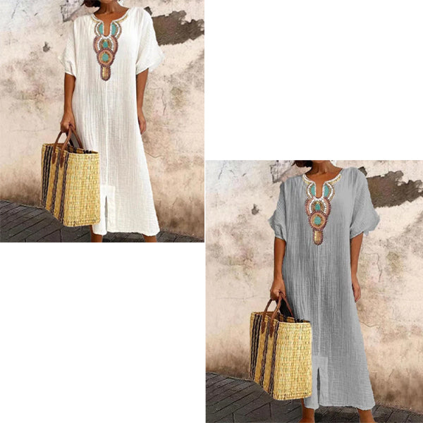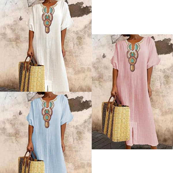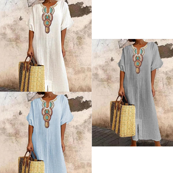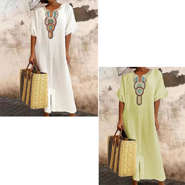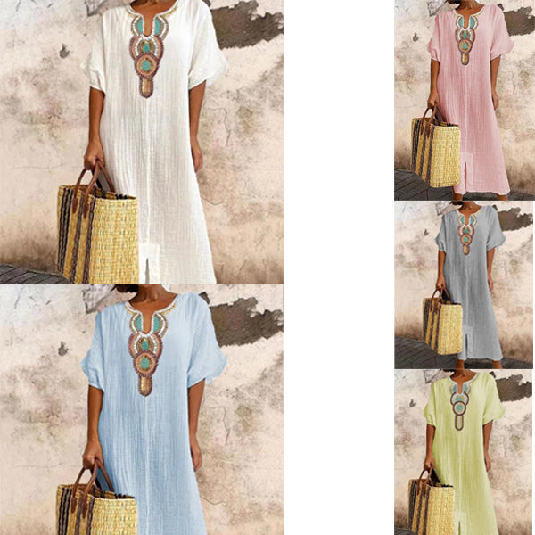Avslappnad, lös damklänning i bomull och linne med broderi och slits