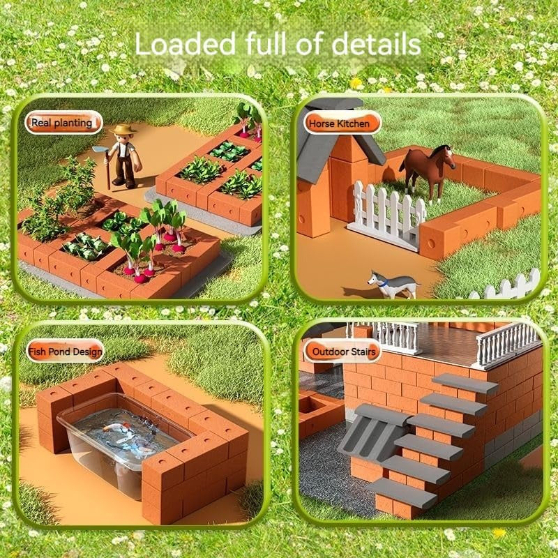 Inkluderar en grönsaksträdgård och en fiskdamm. Barn kan plantera frön, sköta små växter eller föda upp små fiskar – och kombinera bygglekar med realistisk lek.