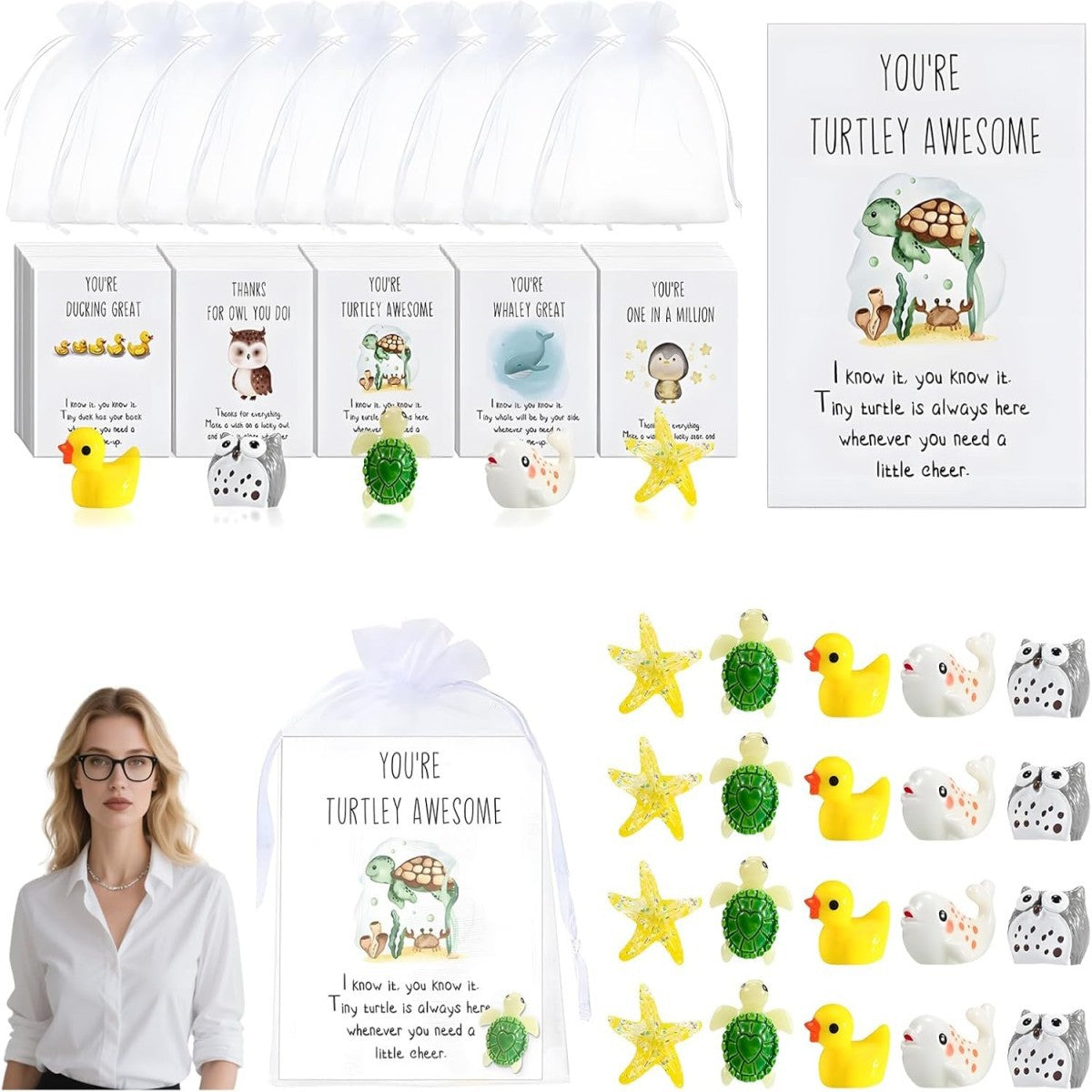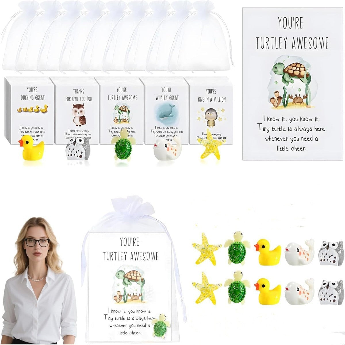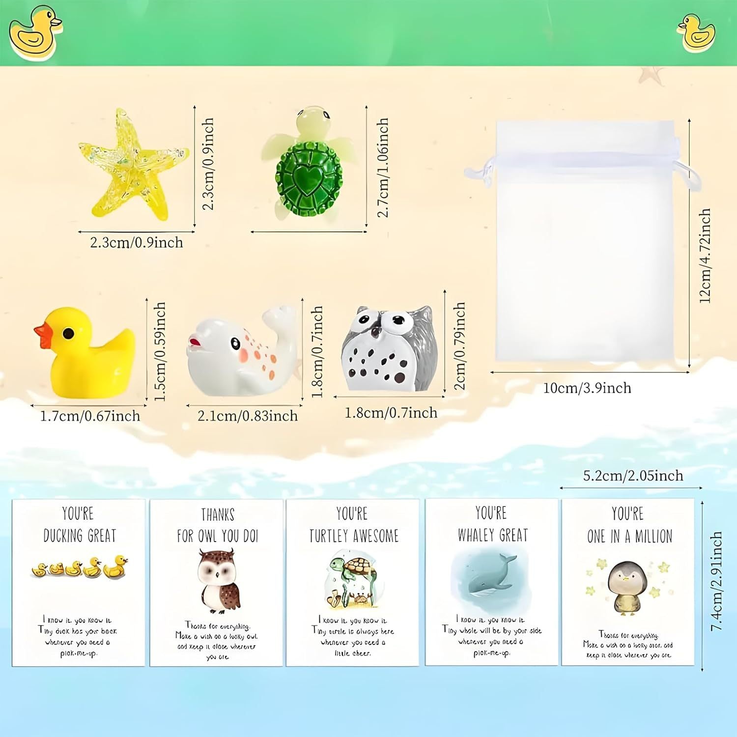 5 Set İçeriği: 5 reçine hayvan hediyesi (🦆 ördek, ⭐ yıldız, 🐋 balina, 🐢 kaplumbağa, 🦉 baykuş) + 5 motivayonel not kartı + 5 ayrı ayrı paket lenmiş