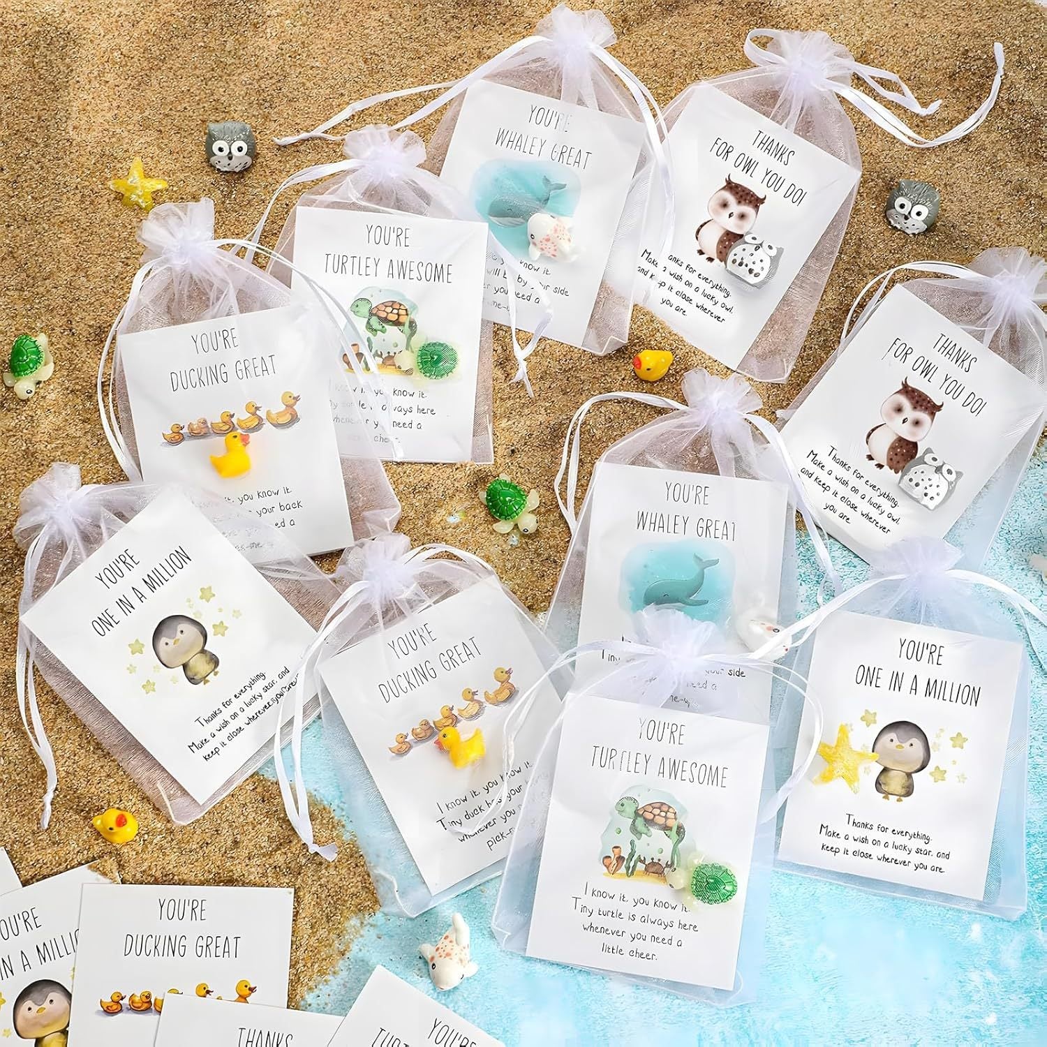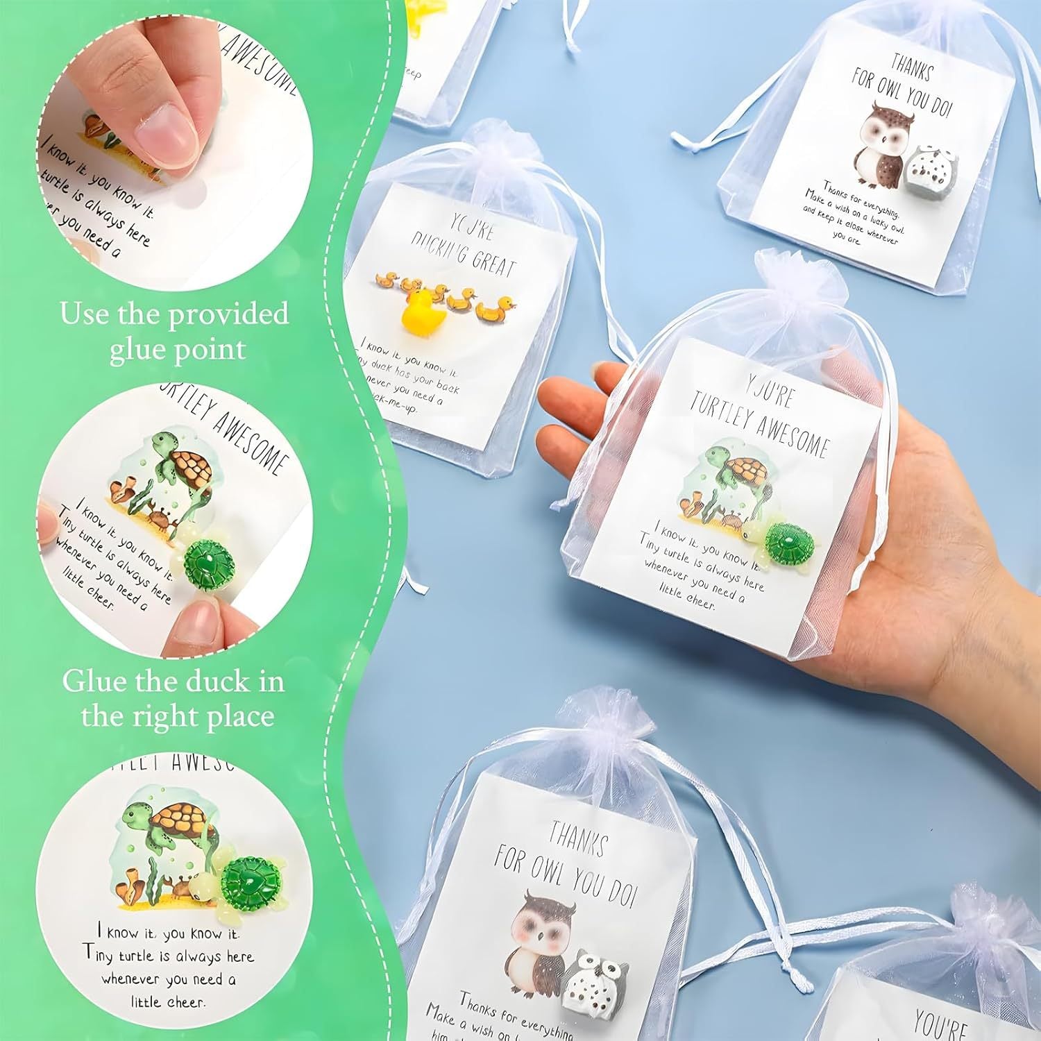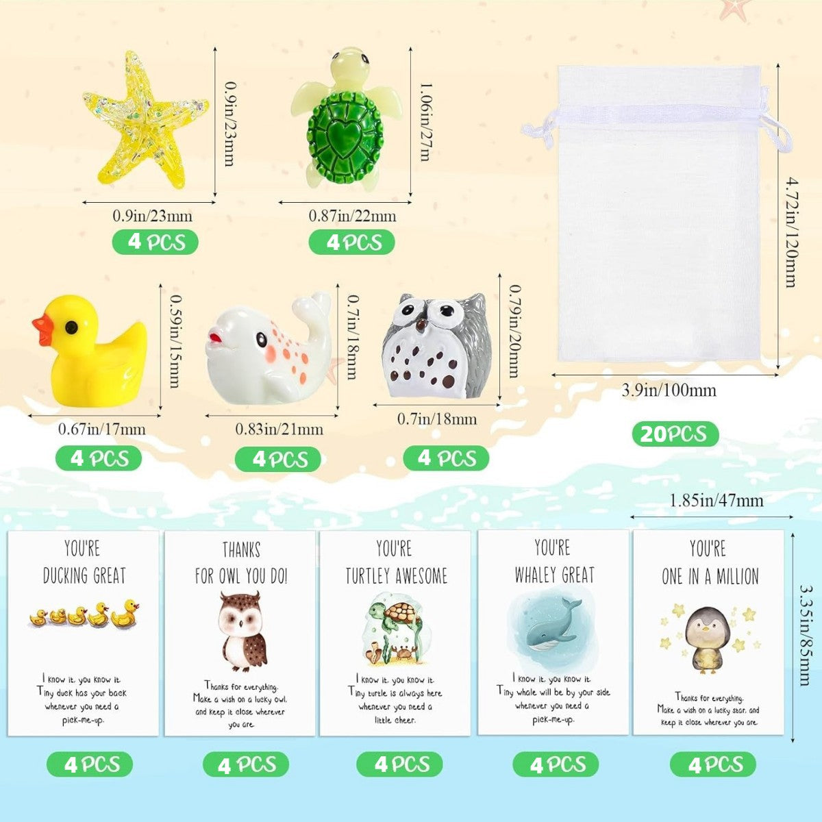 5 Set İçeriği: 5 reçine hayvan hediyesi (🦆 ördek, ⭐ yıldız, 🐋 balina, 🐢 kaplumbağa, 🦉 baykuş) + 5 motivayonel not kartı + 5 ayrı ayrı paket lenmiş