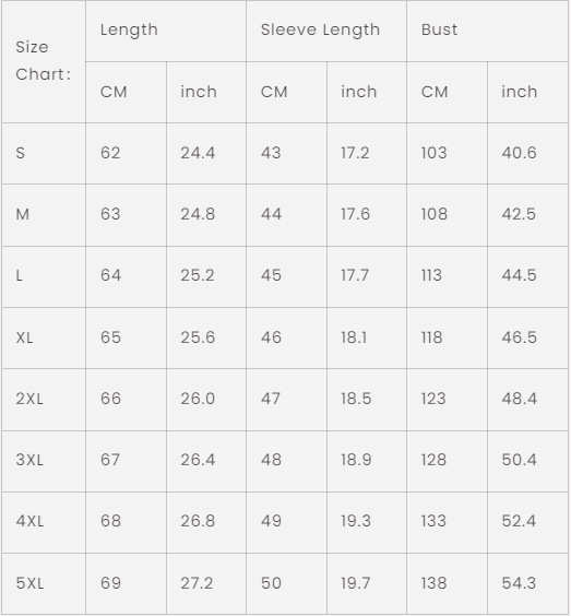 S, M, L, XL, XXL, 3XL, 4XL, 5XL