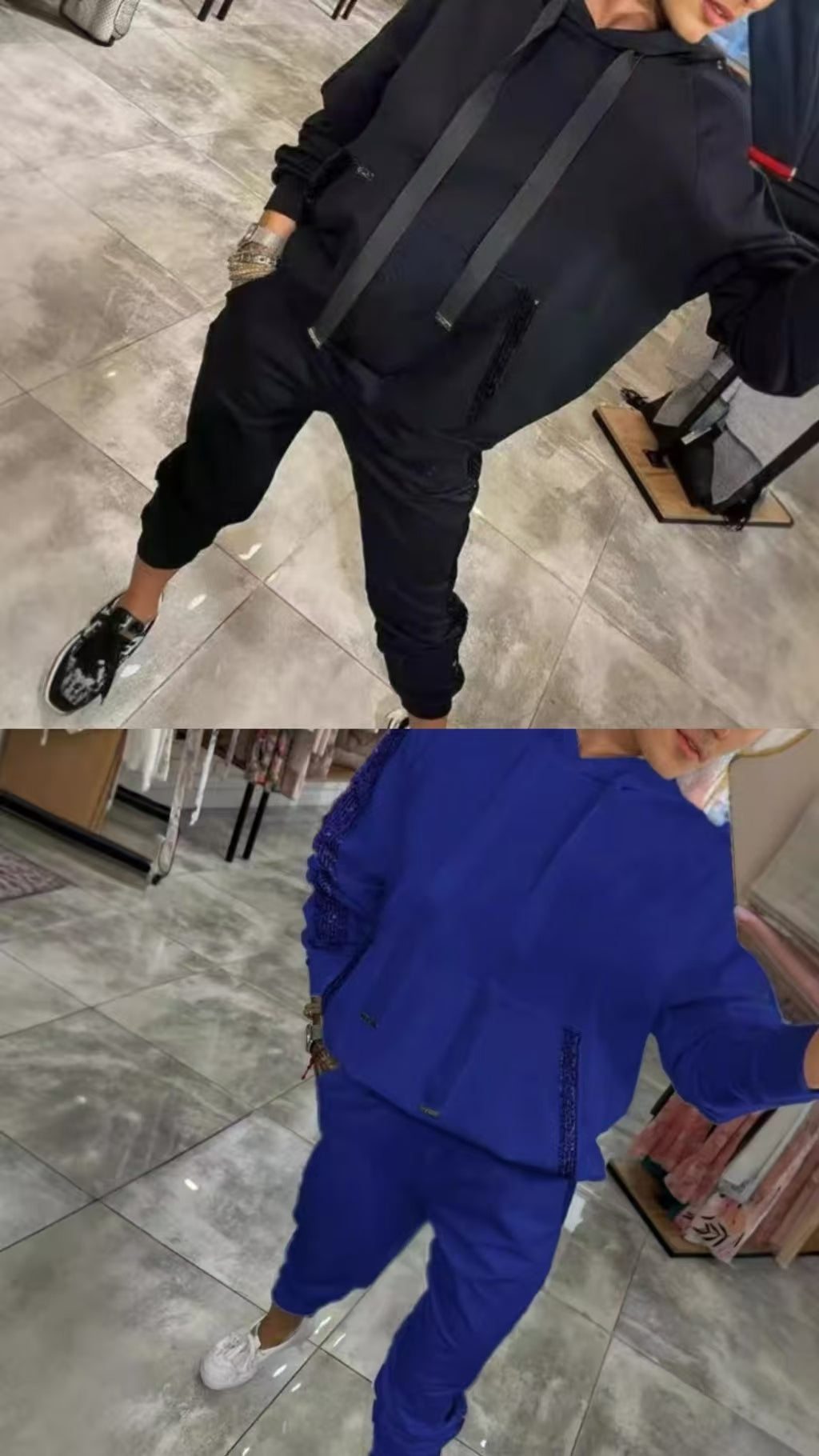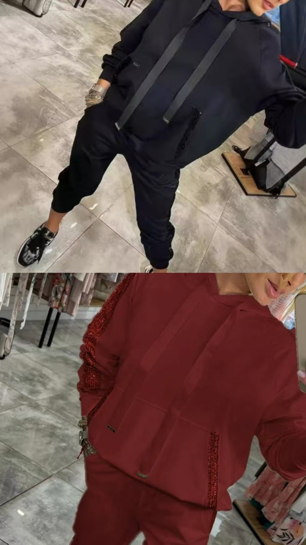 MODIGA ACCENTER: Glittrande utsmyckningar längs ärmarna, fickkanterna och sidsömmarna på byxorna ger en moderiktig touch och ser till att din outfit sticker ut snarare än blir tråkig.